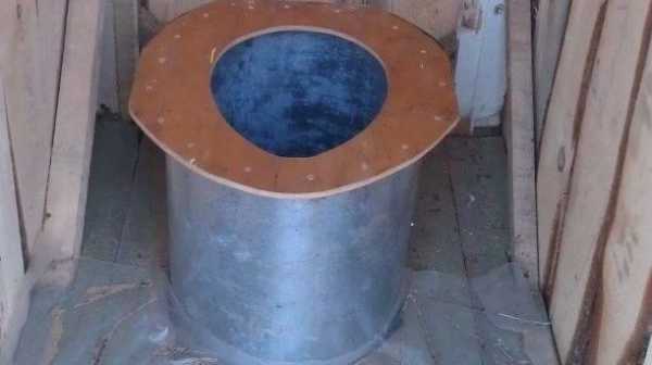 Туалет из оцинкованного металлаМеталлические конструкции установить достаточно легко своими руками. В качестве материала используется оцинкованная сталь. Такой стульчак выглядит в форме цилиндра. Нижняя и верхняя часть имеет припуски для крепления. Для этого на них делают небольшие надрезы, на расстоянии 5 см.
