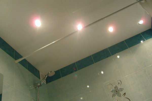 - Потолок с точечными светильниками из гипсокартона в ванне