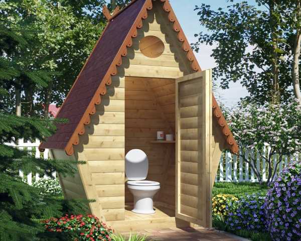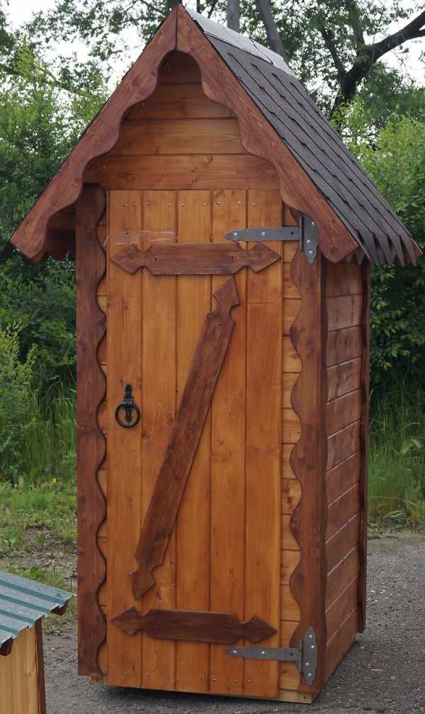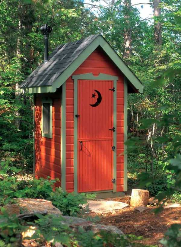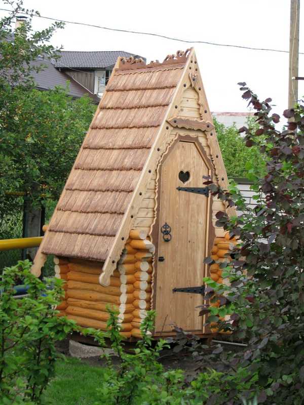 Можно построить стандартную, ничем не примечательную кабинку – а можно украсить ручки и крышу резьбой или росписью. Оригинальная форма и украшения превратят обычный дачный туалет в сказочную избушку.