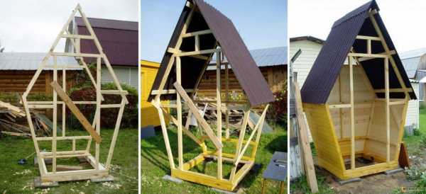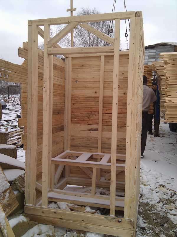 С помощью стоек, рам и перекладин формируется каркас будущей кабинки – стены, сиденье, окошко для вентиляции, потолок, скат крыши, дверь.