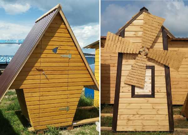 - Конечный этап — сбивание из досок одной (или двух дверей) и навешивание на петли. Для навешивания входной двери можно использовать две или три петли, для задней дверки достаточно двух петель. Механизмы закрывания-открывания могут быть сделаны в виде крючков, защелок, шпингалетов, деревянных задвижек. Над входной дверью (под самой крышей) чаще всего делают застекленное окошко.