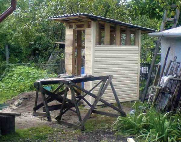 - Когда каркас готов, делается обшивка из досок толщиной 15−25 мм. Для этого могут понадобиться дополнительные перекладины на каркасе. Доски располагаются вертикально и плотно подгоняются друг к другу. Обшивая боковые стенки, необходимо верхнюю часть досок обрезать под углом, позволяющим установить крышу с наклоном. Крышу можно покрыть тем же материалом, что и остальные строения на участке, или сделать из досок, подложив под них рубероид или другой гидроизолирующий материал.