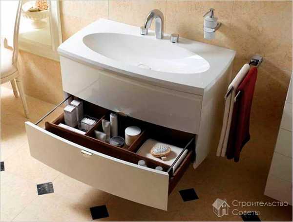Также конфигурация конструкции будет зависеть от формы самой раковины. Они бывают прямоугольные или овальные, накладные или врезные. В соответствии с этим выбирается и форма тумбы.