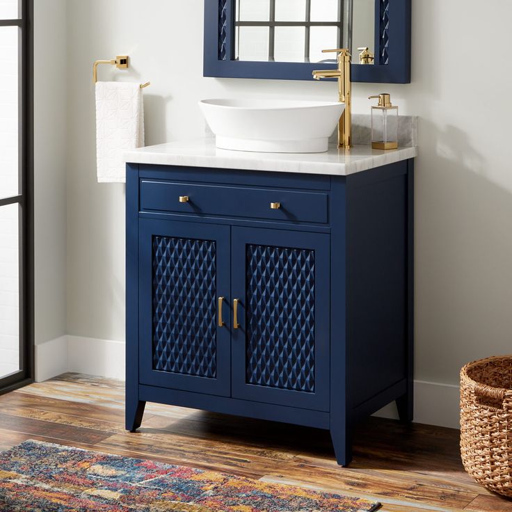 modernes badezimmer mit blue wänden und weißem marmor mit einem großen runden spiegel in goldfarbenen weißen möbeln und einer schüsselförmigen. — туалетный столик с фото и фотографиямиModernes Badezimmer mit blue Wänden und weißem Marmor mit…