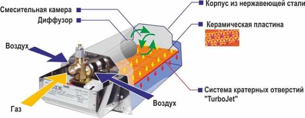 Инфракрасный керамический газовый обогреватель функционирует на том же принципе, что и металлический. Однако здесь газ проходит через сложную структуру, сформированную из перфорированных пластин. Керамика разогревается до больших температур в сравнении с металлом, поэтому устройство отдает значительное количество тепла.