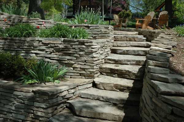 План усадьбы на холме в вертикальной плоскости невозможно представить без лестницы и благоустроенных садовых тропинок. Главная лестничная конструкция, предназначенная для передвижения вверх и вниз, может входить в состав террас или быть выложена из камня на холме обособленно.Внимание! Важно, чтобы ступени были удобными для перемещения и гармонировали с оформлением участка.