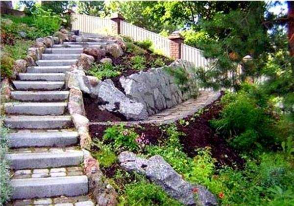 Когда уклон склона сильный и крутой, лестницы оборудуют перилами, а также фонарями. Такой прием повышает общую безопасность наклонного участка. Материалы для лестниц и дорожек не должны быть скользкими или неровными.