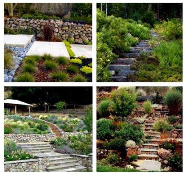- Популярным и издревле известным методом укрепления склонов является террасирование — искусственное создание горизонтальных площадок, образующих уступы на склоне. Создание террасы, как правило, выполняет две главные функции. Первая — терраса выполняет чисто функциональное укрепление склона. Второе — создание красочной картины пространства, где перепад высот формирует естественную конструктивную архитектурную форму с элементами растительности. Общую композицию террасы нередко дополняют красивыми декоративными лестницами, дорожками. Часто встречающийся тип дизайнерских решений — альпийские горки или альпинарии.