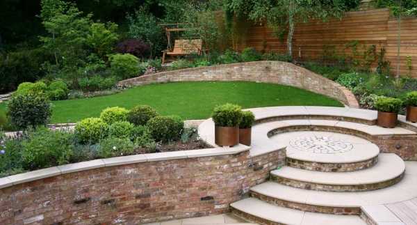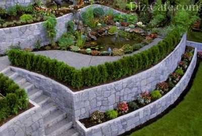 На рельефных участках можно выполнить почти любое дизайнерское решение. Это может быть маленький садик в японском стиле, французский парк, деревенский садик, сад в стиле модерн или кантри. Используйте перепады террас для создания водопадов и прудиком, не забыв укрепить их бетонными блоками, высаживайте вьющиеся растения, обвивая ими беседки и стены строений.
