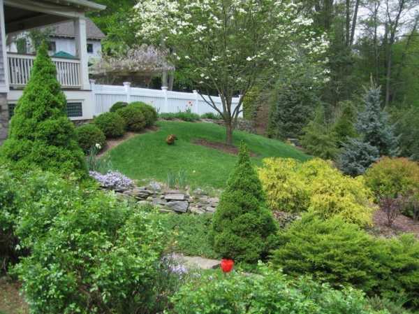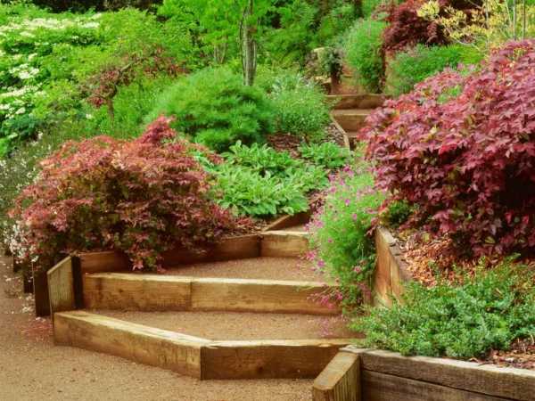 Совет: на склоне рекомендуется располагать кустарники и низкорослые деревья с разветвленной корневой системой: увеличиваясь в объеме, они не только украсят участок, но и поспособствуют укреплению склона.