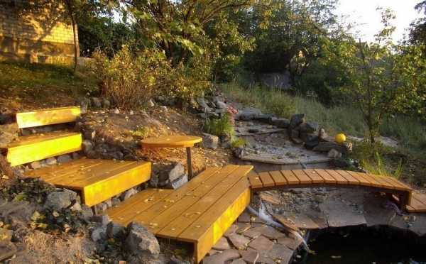 В некоторых случаях добавляют искусственные водопадики. Если к этой общей необычной форме добавить специальные светотехнические эффекты, то можно создать просто сказочный мир. В некоторых вариантах общую непрерывную линию террасы можно прерывать мелкими декоративными формами, например, небольшими беседками, клумбами или скамейками.