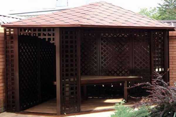 Надо сказать, что беседка угловой формы не только практичная, но и очень нарядно сморится, особенно если ее дополняют плетеные панели или другие декоративные элементы. К примеру, конструкция может иметь решетки, по которым в будущем можно пустить лозы винограда. При этом строение не будет мешать даже на небольшом участке, так как его можно установить в любом его уголке, в прямом смысле этого слова.