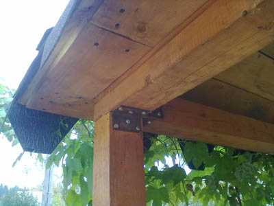 Устройство крыши угловой беседкиПосле того, как каркас крыши выставлен, его обшивают каким-либо жёстким материалом, например: многослойной фанерой или плитами OSB, которые являются отличным основанием для укладки кровельного покрытия. При желании крышу можно сделать прозрачной или в виде перголы- перфорированной.