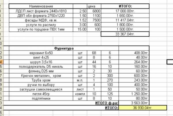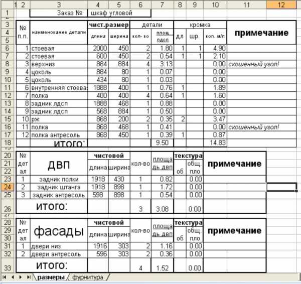 Но вернемся к конструктиву. Картинка шкафа есть, с размерами и внутренним наполнением определились, можно расписать деталировку. Самый простой способ – забить ее в такую табличку в экселе: