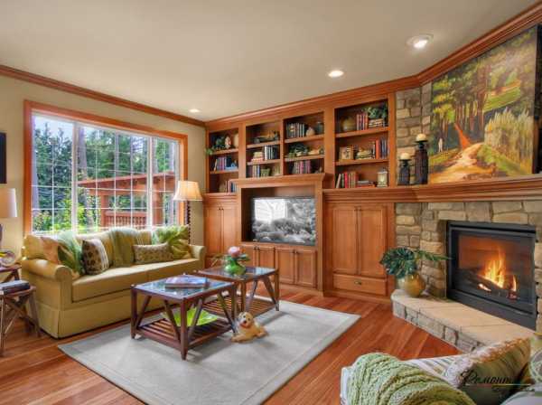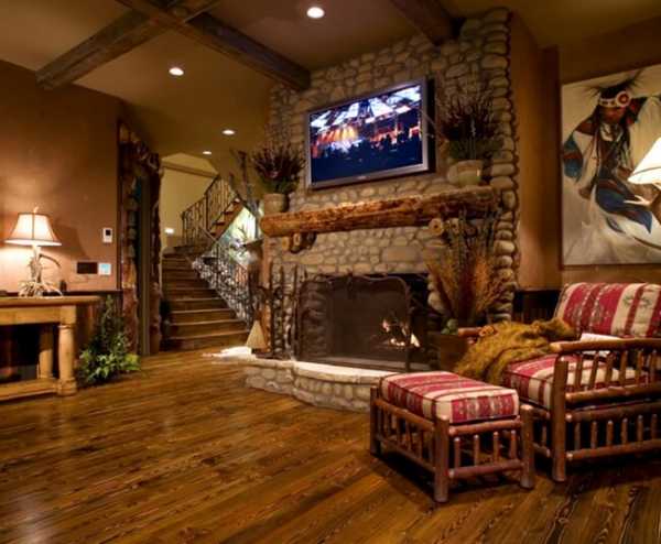 Камины в стиле рустик напоминают русскую печь – топка прямоугольной или арочной формы обрамлена кирпичной или каменной отделкой, под ней часто располагается дровница, а боковые стороны плавно переходят в полки. Общий вид спереди напоминает букву «Д». Для отделки таких каминов используют натуральные материалы или их имитацию: камень, клинкерная плитка, металлический декор – все эти материалы отлично сочетаются с деревянной отделкой дома. Верхнюю полку и боковые полочки из резного дерева украшают домашней утварью в деревенском стиле. Благодаря такому оформлению гостиная приобретает уютный вид, стилизованный под загородный дом.