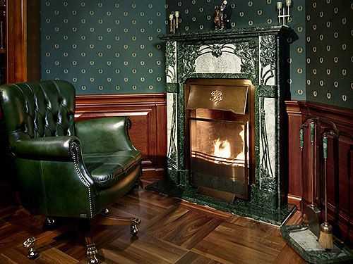 Это современная вариация классических каминов, сохранившая П-образную форму портала. При отделке в стиле «модерн» допускается использовать любые материалы: традиционный камень и дерево, плитку, полиуретан, современное огнеупорное стекло, чугунные элементы. Стилю «модерн» характеры классические линии и витиеватый декор успешно сочетаются с современными отделочными материалами, что позволяет упростить установку и сделать ее более доступной для любого желающего.