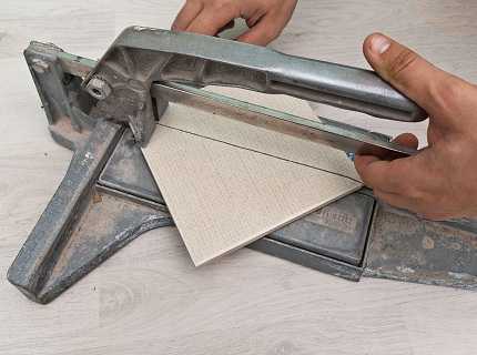 Сначала нужно снять точные обмеры, создавая метки маркером. Потом можно делать резку плинтуса, прижимая его к твёрдой плоскости стола или верстака. Вместо инструмента лучше всего применять углошлифовальную машинку (угловую шлифмашинку) с дисками, имеющими мелкое алмазное напыление. Она дает возможность приобрести идеальный и чистый срез, не повреждив глазурь плинтуса.
