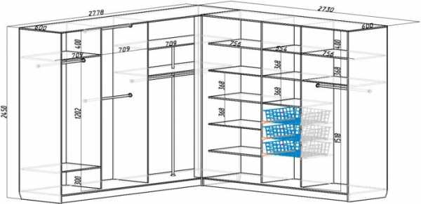 Анализируя ассортимент угловой корпусной мебели, можно сделать вывод о некоторой стандартизации основных размеров угловых шкафов. По внешнему контуру шкафы делают высотой в пределах 2400 — 2450 мм.