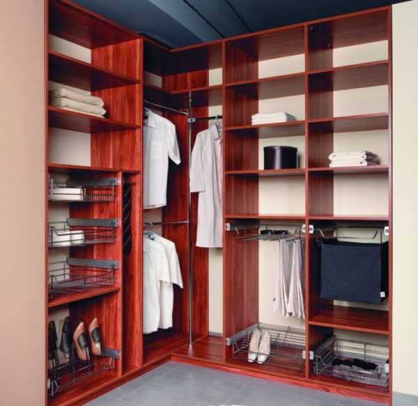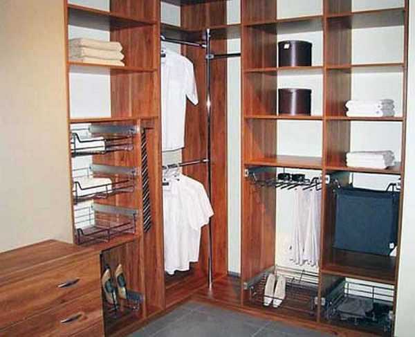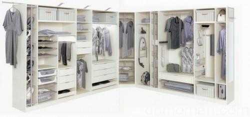 Чаще всего шкафы угловой формы ставят в малогабаритных квартирах, чтобы разместить в них максимальное количество элементов гардероба и прочих нужных вещей. Чтобы с наибольшей эффективностью использовать все пространство мебели, стоит заранее подумать об элементах наполнения: