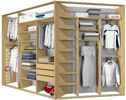 При глубине шкафа меньше 50 см удобней будет расположить короткие штанги для одежды вдоль боковых стен. Если глубина больше, лучше установить одну штангу вдоль задней стенки. При грамотном использовании площади всего углового шкафа вам удастся расположить внутри все предметы гардероба, включая одежду, обувь, постельное белье, полотенца и другое. Владельцам же жилой площади больших размеров можно создать целую гардеробную комнату из подобного шкафа, где поместятся также инструменты, спортинвентарь, чемоданы и прочие нужные вещи.