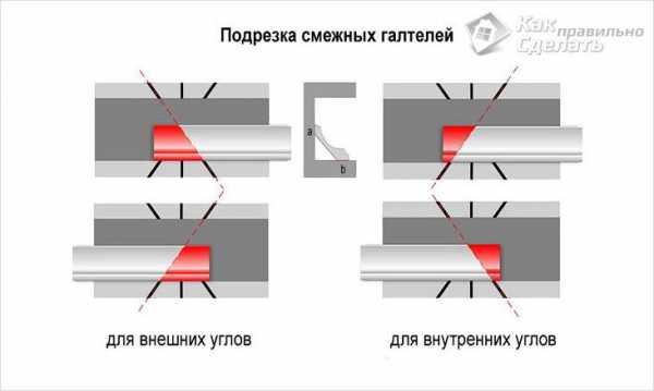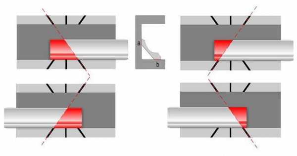 С внутренним углом потолочного плинтуса ситуация очень похожа. Сначала примериваете, какая сторона окажется на потолке, эту часть прижимаете к дну стусла, вторую часть опираете на ближнюю к вам стенку и делаете запилы так, как нарисовано на фото ниже.