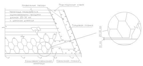 По поверхности с определенным нахлестом разворачивают подкладочный ковер. Величина нахлеста составляет 10 см в поперечном направлении, и 15 в продольном. Подкладочный ковер крепится к настилу оцинкованными гвоздями, с величиной шага между примерно 20 см. Зону нахлеста покрывают специальной битумной мастикой для повышения надежности.