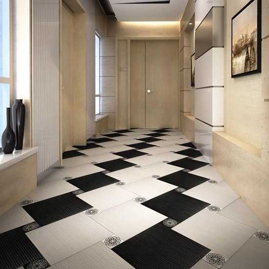 Сетка из модулей разной величины позволяет создавать разные рисунки на полу. Лучше всего такой способ подходит для малогабаритных помещений, так как может их визуально расширить.