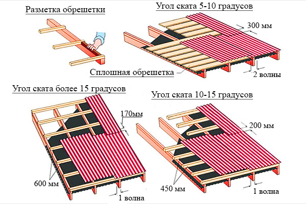 Сплошная обрешетка обустраивается при минимально допустимом угле наклона, так как в этом случае она испытывает максимальную нагрузку.