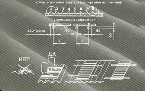 Листы требуется монтировать с нахлестом по горизонтали в одну или две волны. Нахлест в одну волну чаще всего применяется, если требуется покрыть достаточно крутой скат с небольшой снеговой нагрузкой. Нахлест в две волны обязателен для пологих скатов, такая конструкция значительно надежнее, но и общая стоимость покрытия при таком монтаже возрастает, особенно при большом шаге волны. По вертикали верхний лист должен перекрыть нижний не менее чем на 200 мм .