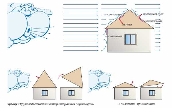 Если в регионе, где строится здание, существует опасность сноса кровельного покрытия сильными порывистыми ветрами, то крыши для понижения парусности делаются более пологими.