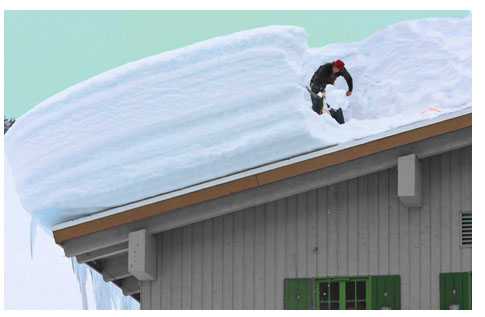 В отличие от дождевой воды, которая очень быстро стекает с кровли, снег может задерживаться на ней длительное время. Легко представить, какую нагрузку должна выдерживать крыша, если уровень снежного покрова в некоторых регионах может составлять один метр и более. Чем больше угол наклона кровли, тем сложнее снежной массе задерживаться на ней, и при определенной толщине покрова, снег с крутой крыши неминуемо сползет под собственным весом.