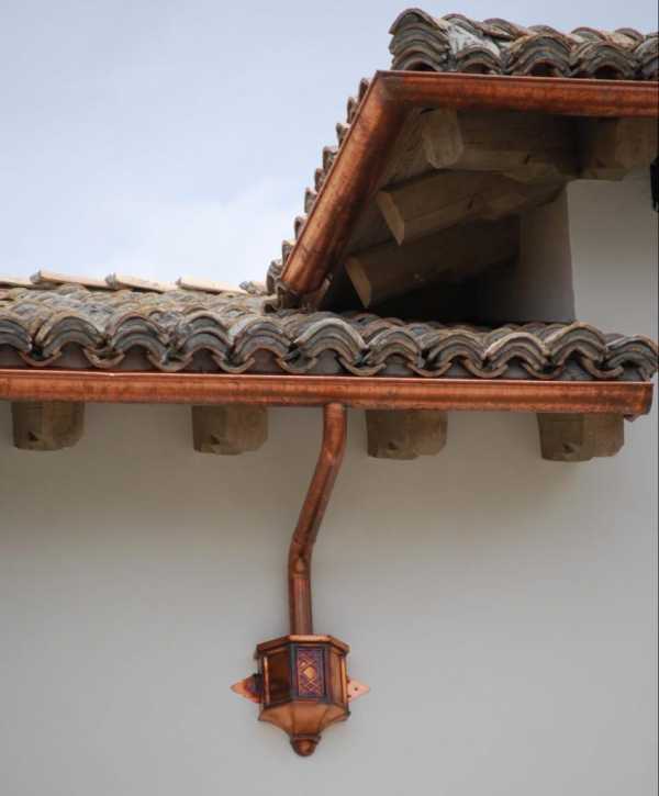 Если коротко, то это дорого, эксклюзивно и еще раз дорого. Крайне редко встречается. Такая водосточная система устанавливается на роскошные загородные дома, оформленные в определенной стилистике. Такой вариант редко встречается по той причине, что мы с вами очень редко бываем в таких домах. Срок годности такого варианта практически не ограничен, так как медь не будет ржаветь в процессе эксплуатации. Ее нужно лишь изредка очищать от окисла.