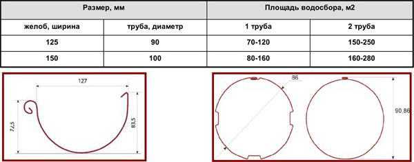 - для кровель, площадь которых не превышает 130 квадратных метров вполне можно обойтись одним водостоком с диаметром трубы 85-110 миллиметров и сечением желоба 115-125 миллиметров;