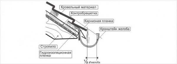 Лучше конечно прикрепить кронштейны еще на этапе монтажа обрешетки кровли. Идеальным вариантом будет, чтобы шаг держателей для желобов совпадал с шагом стропил – где-то в пределах 50-60 сантиметров.
