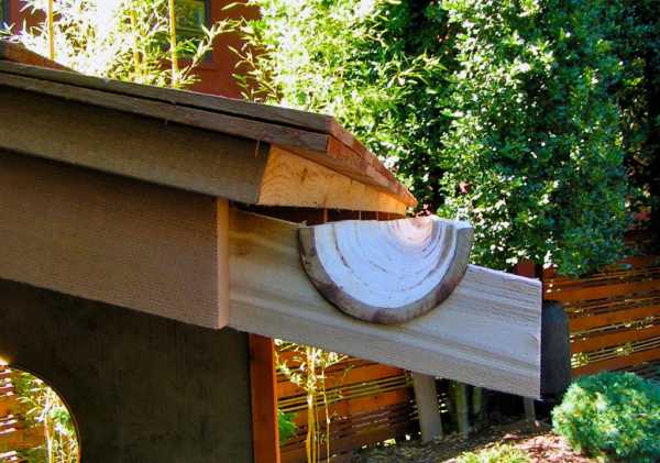 Устаревший вариант, но иногда его можно встретить и в современных постройках, если их дизайн стилизован под старину. Такая система не слишком долговечна. Плюс к этому в желобе из древесины скапливаются мусор и грязь, по этой причине уклон водосточного желоба из дерева нужно делать более значительным, чем в случае с каким-либо другим современным материалом. Нужный уклон можно найти в этом случае путем проб и ошибок. Смонтируйте пробный вариант, если окажется недостаточно, то сделайте круче уклон водосточного желоба. СНиП и нормы вам не помогут в этом случае, они рассчитаны на современные варианты, и это явно не случай с деревянным водостоком.