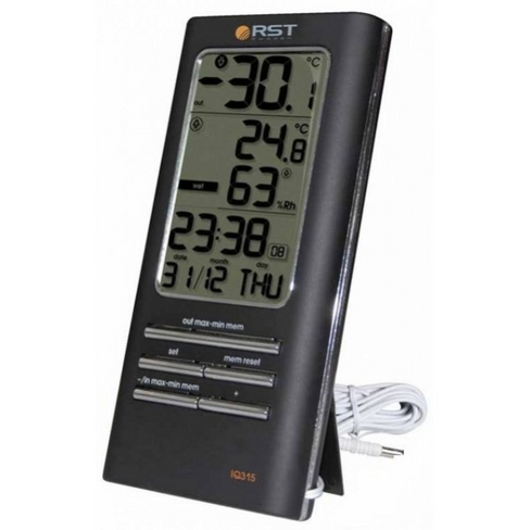 Проводная модель RST 02401 смотрится роскошно с корпусом серебристого цвета. На светлом фоне четко выделяются цифры. Достаточно одного касания к сенсорным кнопкам для настройки градусника, просмотра сохраненных данных за интересующий период.