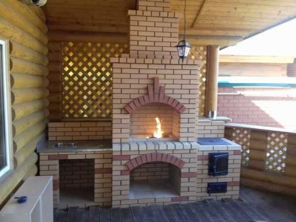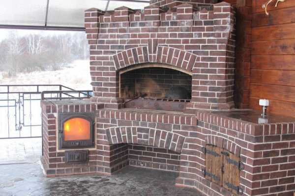 Чтобы иметь возможность не только варить и жарить еду в посуде, а еще и обрабатывать ее огнем и дымом, русскую печь возводят с элементами для установки барбекю, мангала или коптильни.