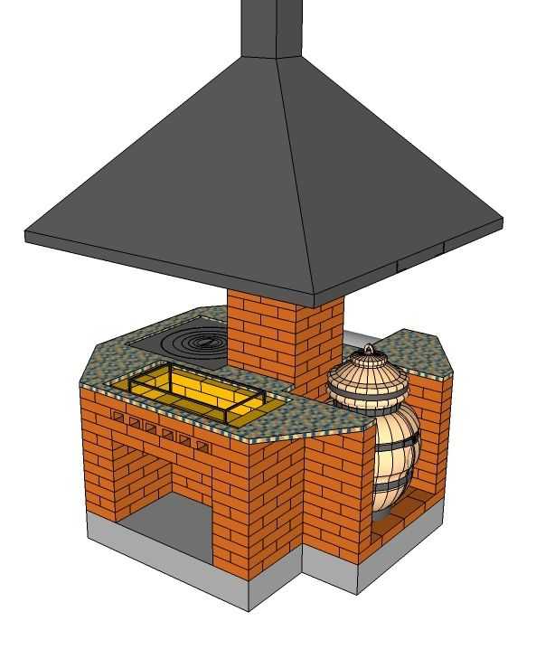 Конструкция стационарного гриля должна предусматривать отверстие в нижней части жаровни для создания тяги воздуха. Желательно также организовать дымоудаление, если позволяет пространство. Обустройство небольшого купола добавит приготовлению блюд комфорт и избавит от назойливого дыма в ветреную погоду.