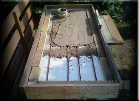 Для этого нужно вырыть котлован глубиной 15 см, сделать опалубку и залить бетоном. В качестве гидроизоляции можно использовать глину. Когда фундамент будет готов и затвердеет, то следует начать возведение стенок. Ровность поверхности определяется при помощи уровня. Специалисты рекомендуют соорудить деревянную раму, чтобы добиться ровных углов.