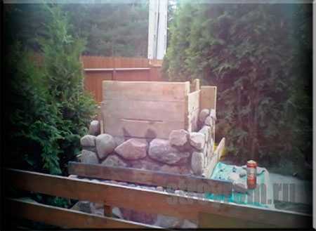 На начальном этапе необходимо сделать фундаментное основание и на нем возвести опорные стены всей конструкции. Для фундамента сбиваем деревянный каркас желаемого размера, заливаем цементно-песчаный раствор и в него вкладываем камни, при этом соблюдаем горизонтальный уровень. После собираем на площадке деревянный каркас, который будет служить внутренней опорой для каменных стен, что в свою очередь намного облегчит работу их строительства. Как далать фундамент для барбекю смотреть тут.
