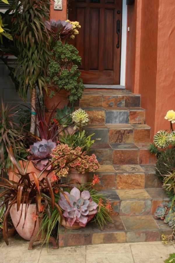 Украшение лестницы из плитки вазонами с декоративными растениями