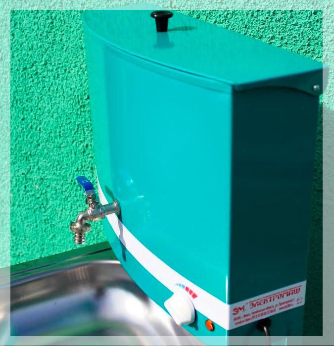 ΠΡΠ»ΠΈ Π±ΡΡΡ ΠΊΡΠ°ΡΠΊΠΈΠΌ, ΡΠΎ ΡΡΠ°Π΄ΠΈΡΠΈΠΎΠ½Π½ΡΠΉ Π΄Π°ΡΠ½ΡΠΉ ΡΠΌΡΠ²Π°Π»ΡΠ½ΠΈΠΊ Ρ ΠΏΠΎΠ΄ΠΎΠ³ΡΠ΅Π²ΠΎΠΌ Π²ΠΎΠ΄Ρ ΠΏΡΠ΅Π΄ΡΡΠ°Π²Π»ΡΠ΅Ρ ΡΠΎΠ±ΠΎΠΉ Π½Π΅Π±ΠΎΠ»ΡΡΡΡ ΡΡΠΌΠ±Ρ, ΠΎΡΠ½Π°ΡΠ΅Π½Π½ΡΡ ΡΠ°ΠΊΠΎΠ²ΠΈΠ½ΠΎΠΉ. ΠΠ±ΡΠ°Ρ Π²ΡΡΠΎΡΠ° ΠΊΠΎΠ½ΡΡΡΡΠΊΡΠΈΠΈ ΠΏΡΠΈΠΌΠ΅ΡΠ½ΠΎ 150-180 ΡΠΌ, Π² Π²Π΅ΡΡ Π½Π΅ΠΉ ΡΠ°ΡΡΠΈ ΠΊΠΎΡΠΎΡΠΎΠΉ ΡΡΡΠ°Π½ΠΎΠ²Π»Π΅Π½Π° ΡΠΌΠΊΠΎΡΡΡ Ρ Π²ΠΎΠ΄ΠΎΠΉ. Π ΡΠ°ΠΌΠΎΠΌ ΠΆΠ΅ ΡΠ΅Π·Π΅ΡΠ²ΡΠ°ΡΠ΅ Π΄Π»Ρ ΡΠ±ΠΎΡΠ° ΠΈ Π½Π°Π³ΡΠ΅Π²Π° ΠΆΠΈΠ΄ΠΊΠΎΡΡΠΈ ΡΠ°ΡΠΏΠΎΠ»Π°Π³Π°Π΅ΡΡΡ ΡΡΡΠ±ΡΠ°ΡΡΠΉ ΡΠ»Π΅ΠΊΡΡΠΎΠ½Π°Π³ΡΠ΅Π²Π°ΡΠ΅Π»Ρ (ΡΡΠ½), ΠΏΠΎΠ΄ΠΊΠ»ΡΡΠ°Π΅ΠΌΡΠΉ Π½Π΅ΠΏΠΎΡΡΠ΅Π΄ΡΡΠ²Π΅Π½Π½ΠΎ ΠΊ ΡΠ»Π΅ΠΊΡΡΠΎΡΠ΅ΡΠΈ ΠΏΡΠΈ ΠΏΠΎΠΌΠΎΡΠΈ ΡΠ½ΡΡΠ°.