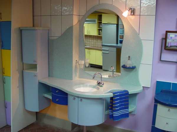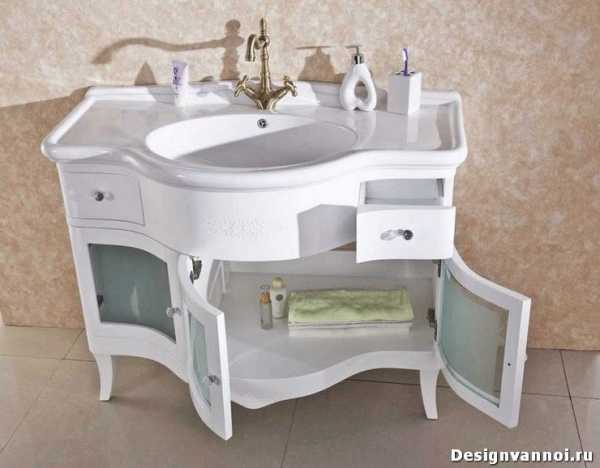 Совет! Дополнив тумбу зеркалом, вы получите шикарный мебельный комплект типа «мойдодыр». Кроме того,встроенная раковина для ванной комнаты расширяет границы декорирования помещения. Детали отделки тумбы и зеркала способны подчеркнуть стиль интерьера, дополнить его яркими элементами, внести стильную изюминку.