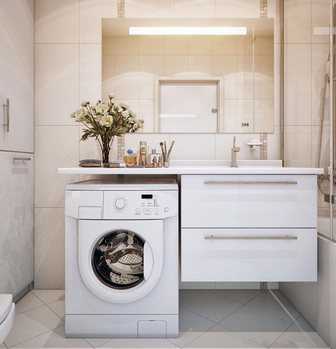 Стиральная машина может стоять ниже раковины или сбоку от нее — это зависит от конструкции слива раковины. При таком размещении получается довольно вместительная столешница, которую можно эффективно использовать.