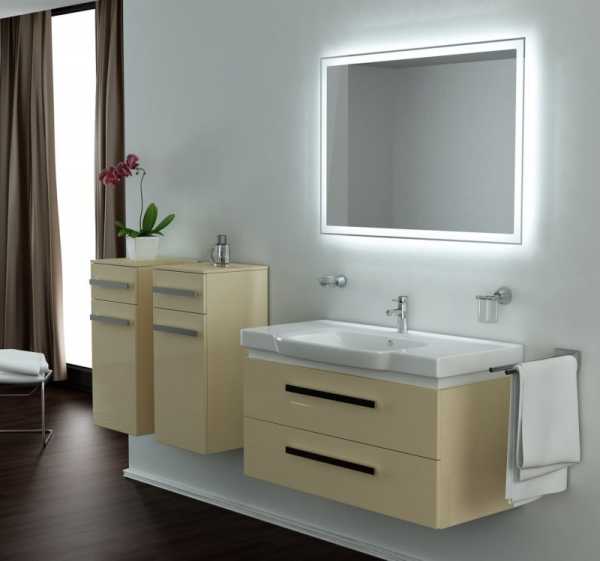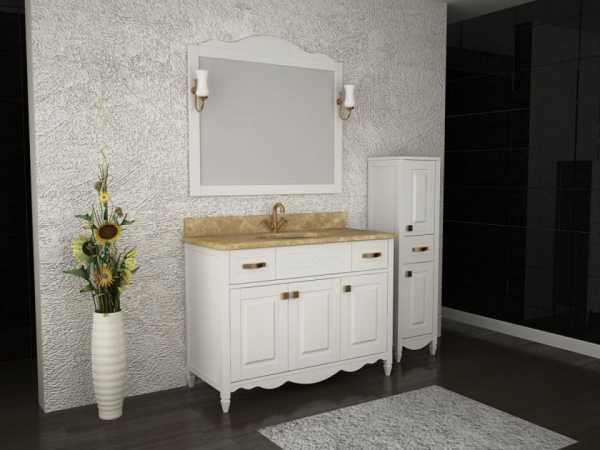 - Для компактной ванной комнаты выбирайте напольный мойдодыр – его размеры не превышают 90см (ширина тумбы), а вот подвесные наборы могут быть полноценной мебелью и иметь габариты до 1,5 метров шириной.