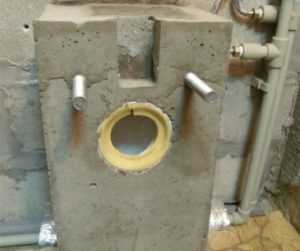 - На этом этапе можно приступать к бетонированию. В итоге бетонное основание должно быть оборудовано штырями для чаши, выводом для муфты и специально отведенным местом для установки сливного бачка. Это упростит монтаж унитаза своими руками. Нужно обязательно дождаться, пока бетон застынет, на что обычно уходит около 2-3 недель.