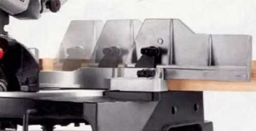 ![]() В самых простых дисковых пилах фиксацию обеспечивает боковой упор | ![]() Более продвинутые торцовочные пилы установлены на специальной станине |