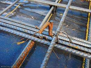 - Укладка каркаса из арматуры. Бетон может быть поврежден при механических нагрузках на изгиб или растяжение, то железобетон легко выдержит подобные испытания. Арматура должна вязаться, а не свариваться, чтобы не потерять коррозийную стойкость и прочность;