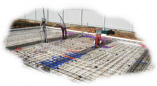 Что касается теплых полов при устройстве данного фундамента: Разводка труб теплых полов уже может производиться на этапе его возведения. Трубы теплого пола хомутами крепятся к арматуре, которая располагается в нижней части плиты. И в результате после заливки вы получаете готовый фундамент в котором находятся трубы теплого пола, а значит вам не нужно будет делать классической системой устройство теплых полов по утеплителю, когда по монолитной плите дома устраивается утеплитель, закладываются трубы теплого пола, делается стяжка, и в результате вы тоже получаете теплый пол, но за эти работы дополнительно платите деньги.