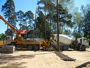 | Фундамент монолитная железобетонная плита должен бетонироваться одномоментно. Разница во времени укладки бетона должна быть не более 1-2 часов (в зависимости от темрературы). Без доставки готового товарного бетона и бетонасоса чаще всего не обойтись. | Класс бетона по прочноcти на сжатие для плоских фундаментных плит должен быть не менее B20 (М250) с водостойкостью не ниже W6 [пункт 7.10 СП 52-103-2007 «Железобетонные монолитные конструкции зданий»]. Таким требованиям соотвествует марка товарного бетона БСГ В 22,5 П3 F150 W6 и марки выше. | |